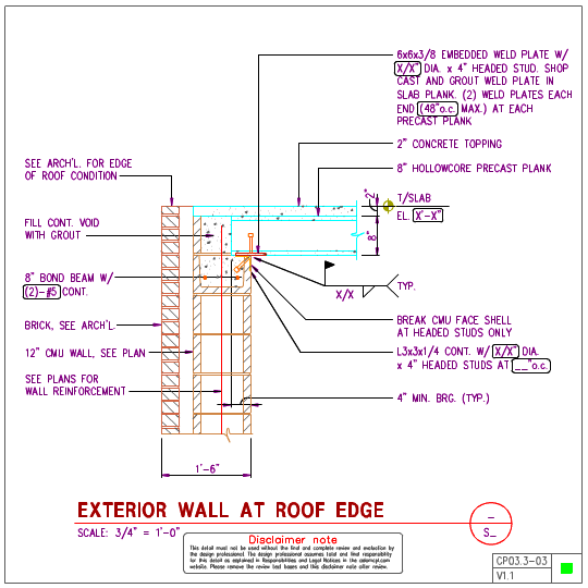 CAD structural details for precast hollowcore roofs bearing on 12 inch masonry walls.