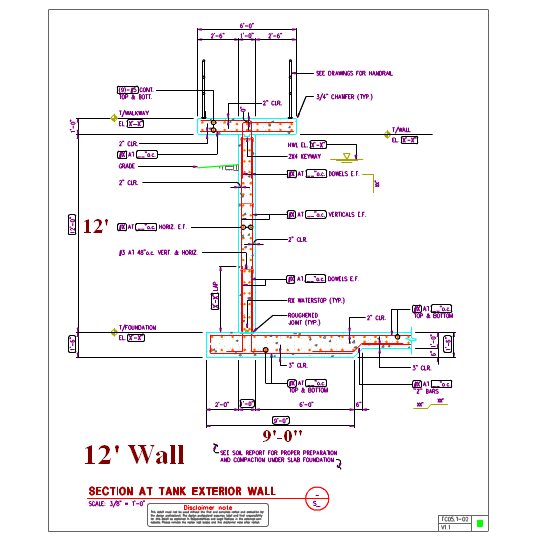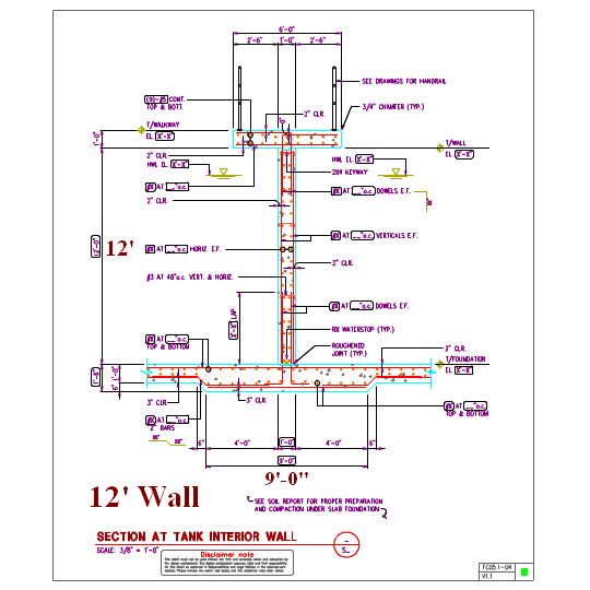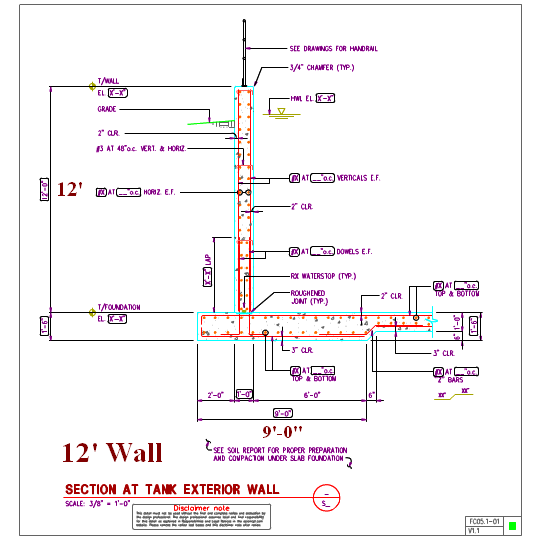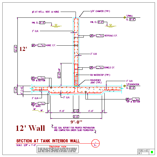 Concrete square tank walls AutoCAD details 12 foot high for civil and water retaining structures.