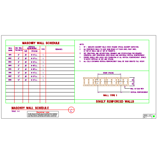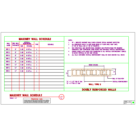 AutoCAD masonry wall schedules for structural drawings showing singly and doubly reinforced masonry walls.