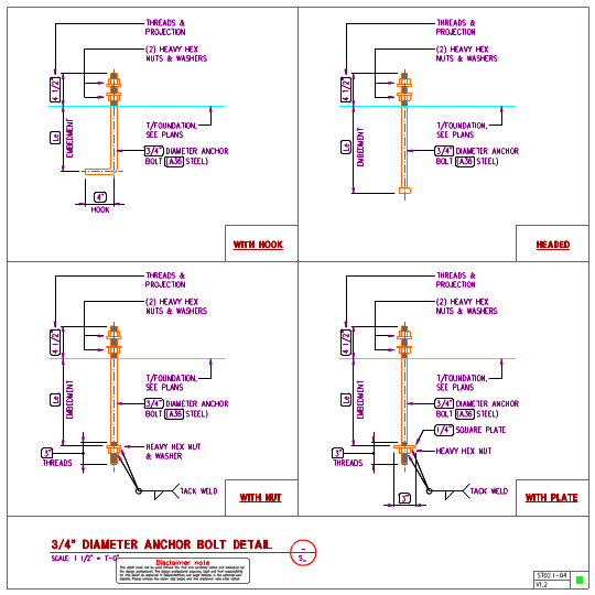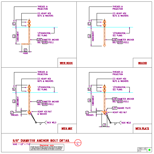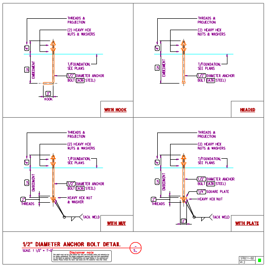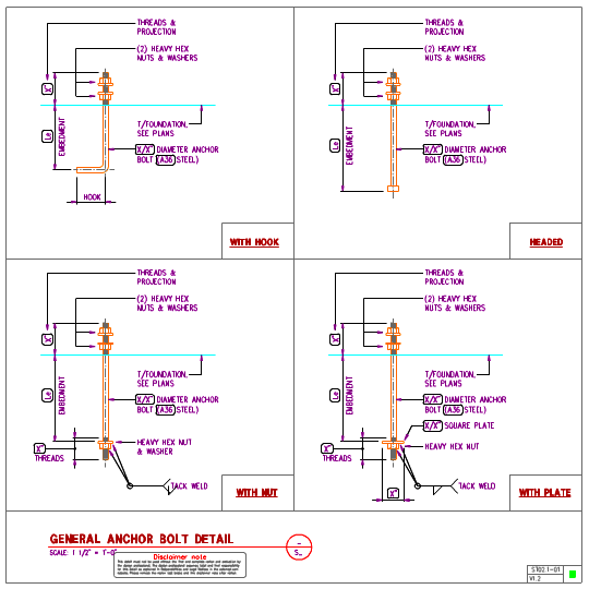 Steel anchor bolts details in AutoCAD format showing anchor bolt sizes, types and anchor bolt embedment.